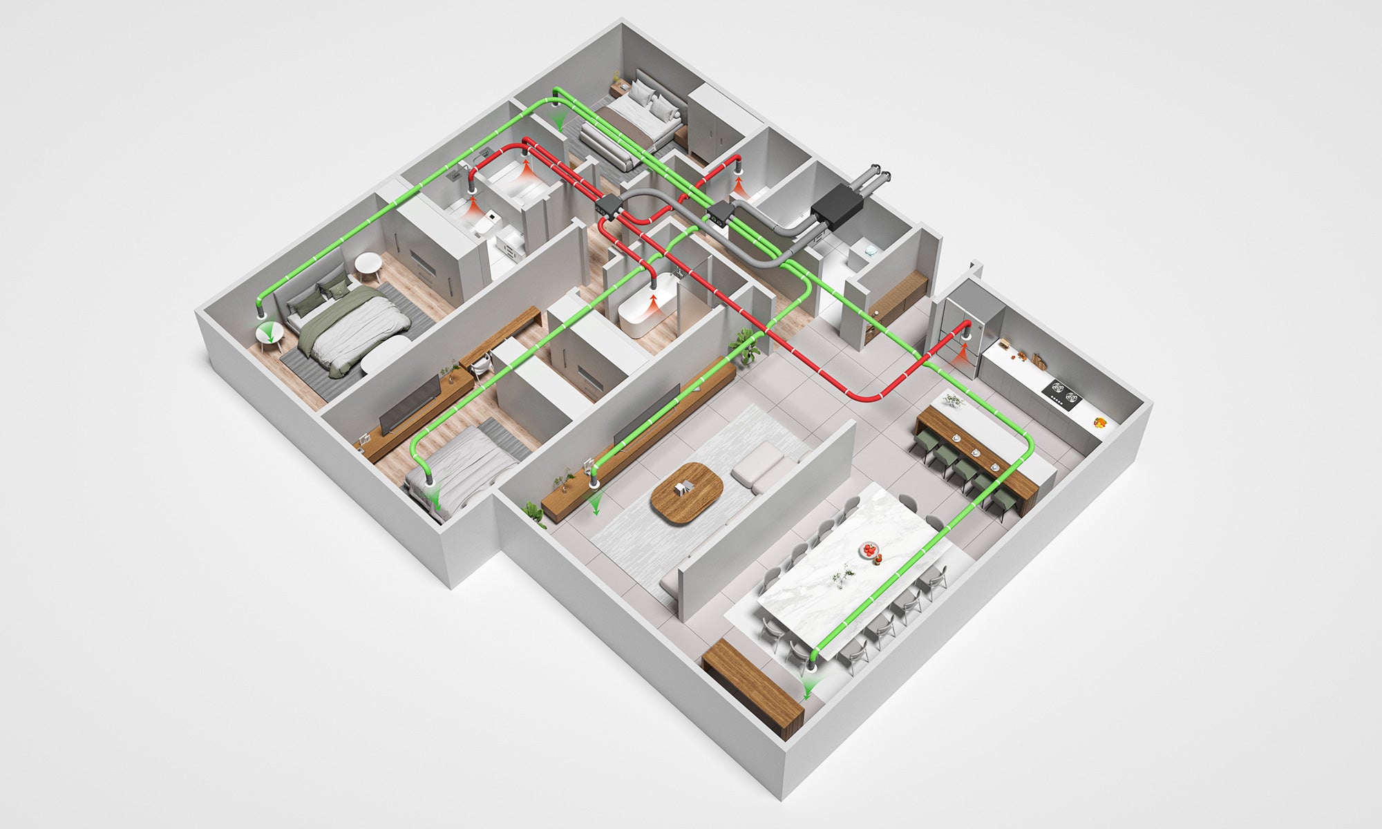 The comprehensive local demand control system is connected with multiple IAQ sensors from internal to external of the ventilation unit. Real-time IAQ data and status are collected for the automation of the system such as airflows, bypass and defrost. Clock control and boost function further enhance the overall efficiency of the system. Complete settings are all on the HD 7" color touchscreen.