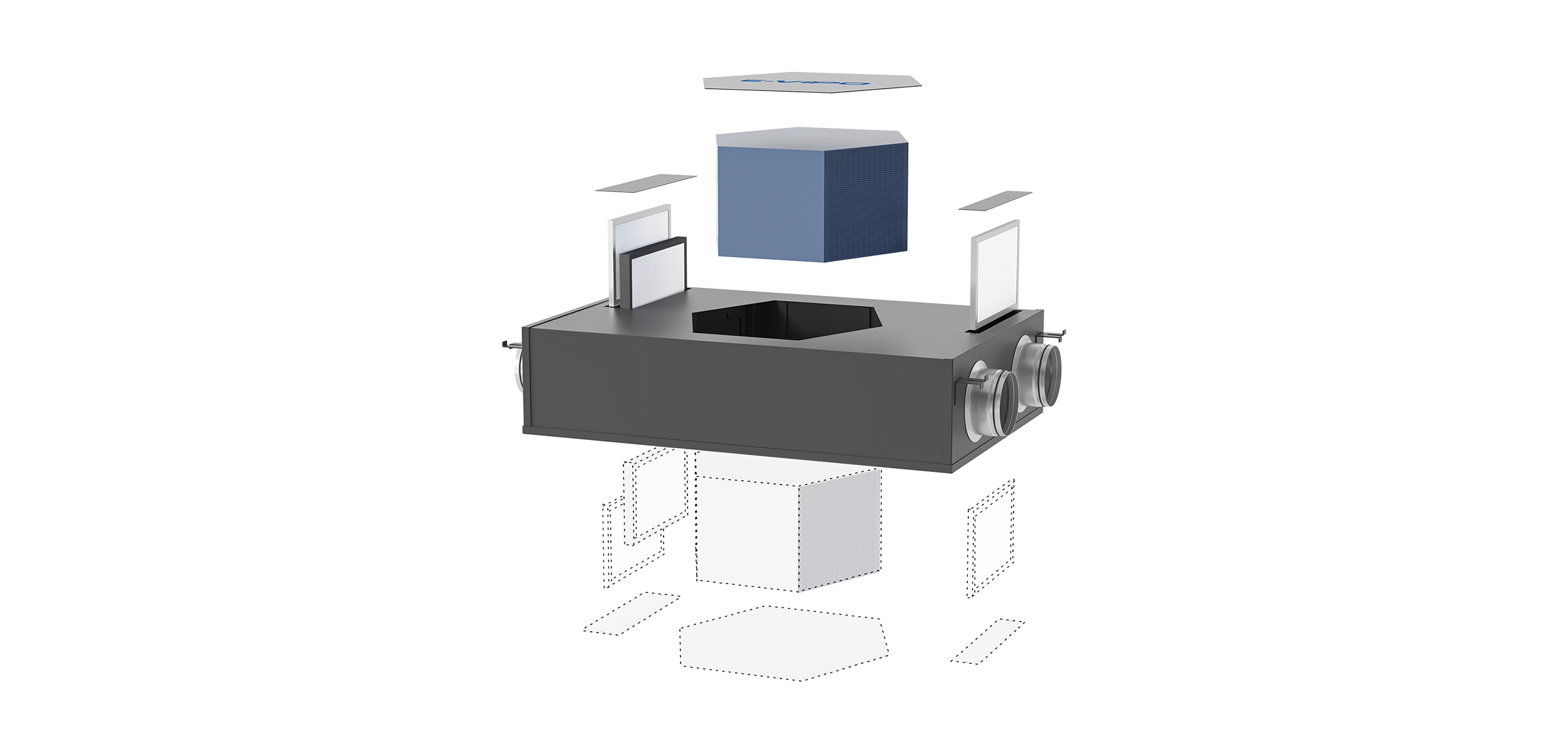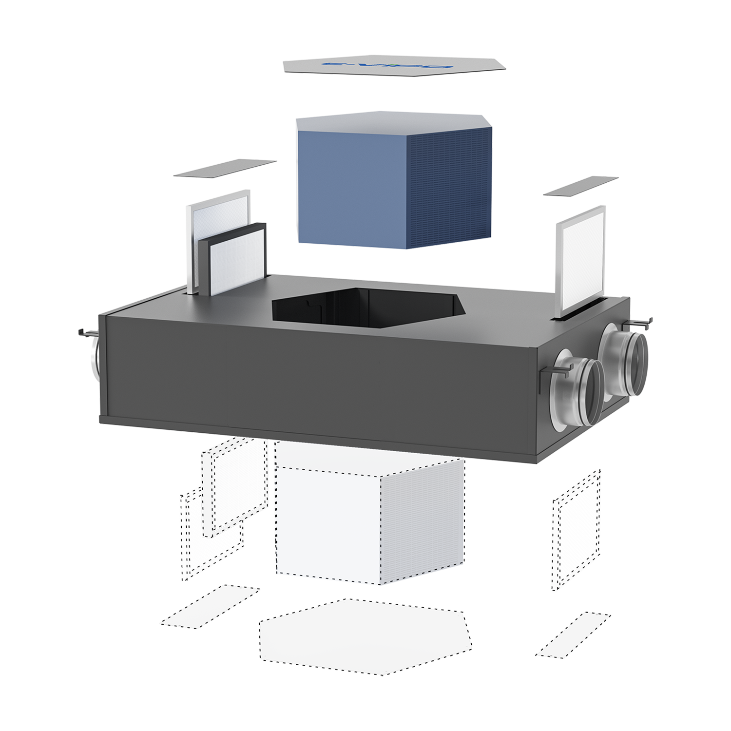 The counter-flow heat recovery core, with large plate area and high density layers, provides a high heat recovery efficiency.