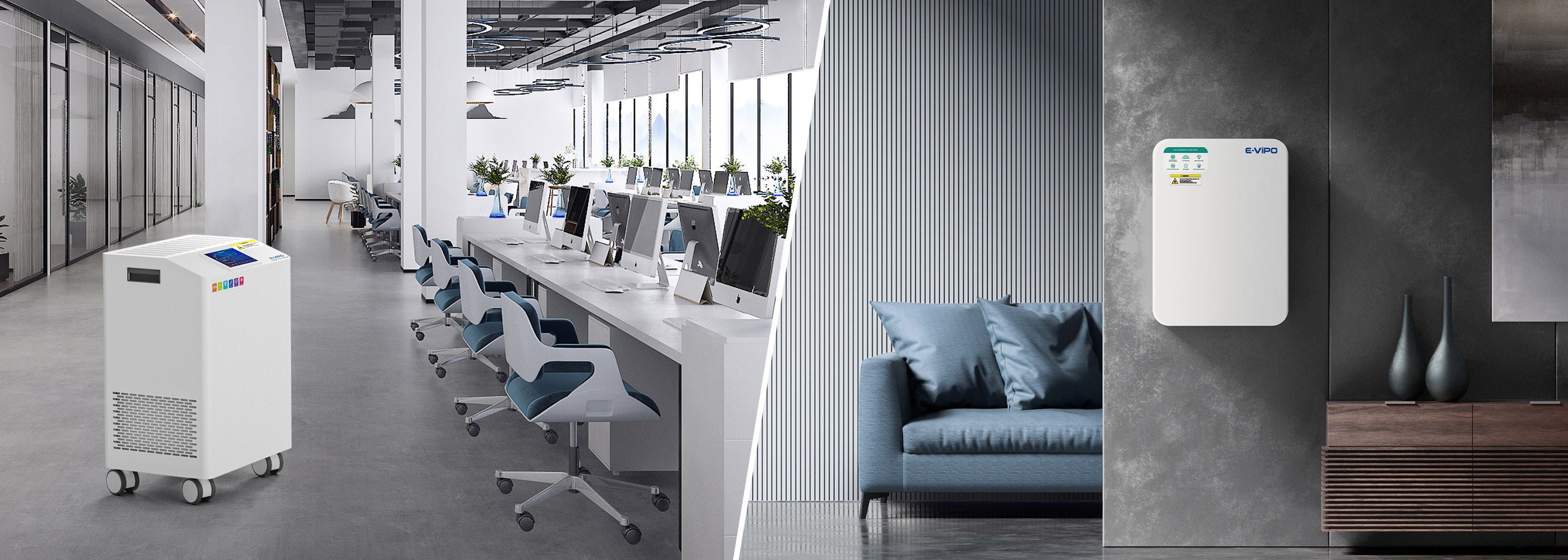 The purification / disinfection units are designed with the best configurations and internal structures. The concept of the design is to form a continuously fast and thorough air circulation for the indoor with a smooth and rapid air flow from the unit. The products are equipped with high-voltage electrostatic IFD, HEPA and up to 72W UV-C, and further equipped with PCO technology for a complete purification and disinfection coverage. The system is paired with a large touchscreen, a smart control with fully automation functions based on the complete IAQ sensors connected. The EC motors in the products are energy saving and highly efficient. The products have a high overall performance in the filtration process. They are tested with an elimination efficiency of >99.99% for Coronavirus, H3N2 and various bacteria.